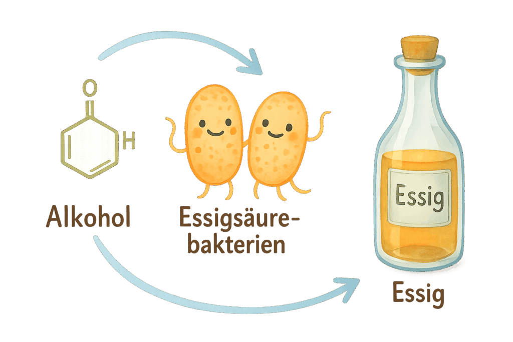 Wenn Alkohol zu Essig wird, haben Essigsäurebakterien ihre Finger im Spiel. Diese Acetobacter-Arten brauchen Sauerstoff für ihre Arbeit und verwandeln den Alkohol in scharfe Essigsäure. Der pH-Wert fällt dabei typischerweise auf 2,5 bis 3,5. So wird etwas aus süßem Kombucha saurer Essig – ein natürlicher Kreislauf der Verwandlung.